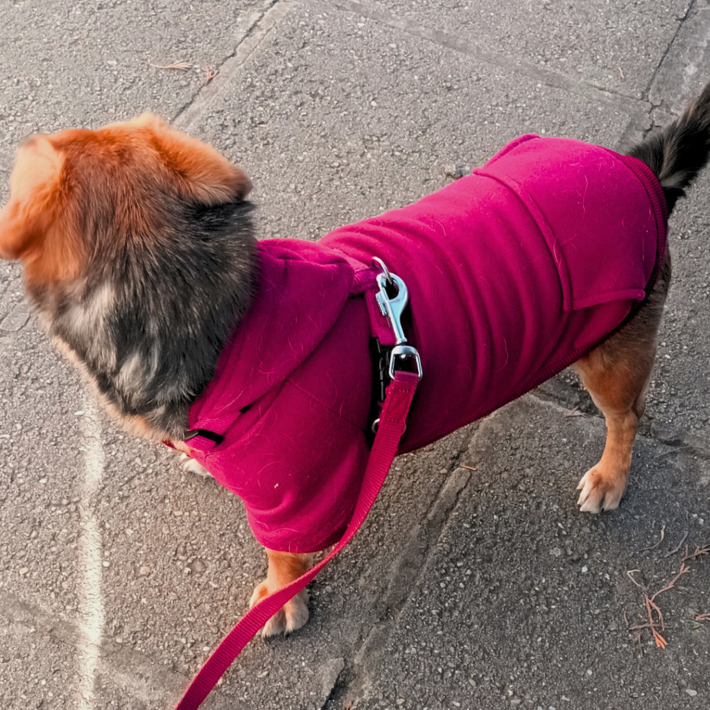 A pulóver takarja a kutya mellkasát, a két mellső lábat, és a has nagy részét.