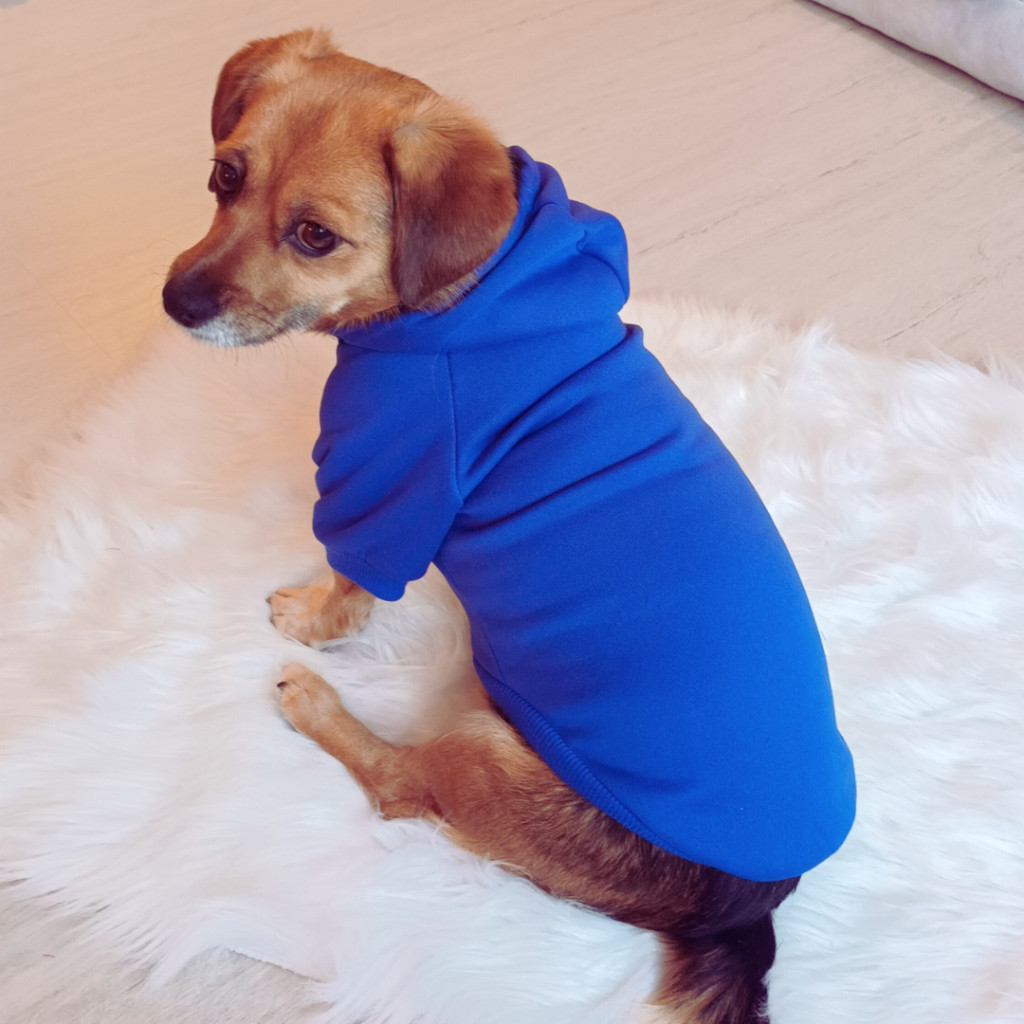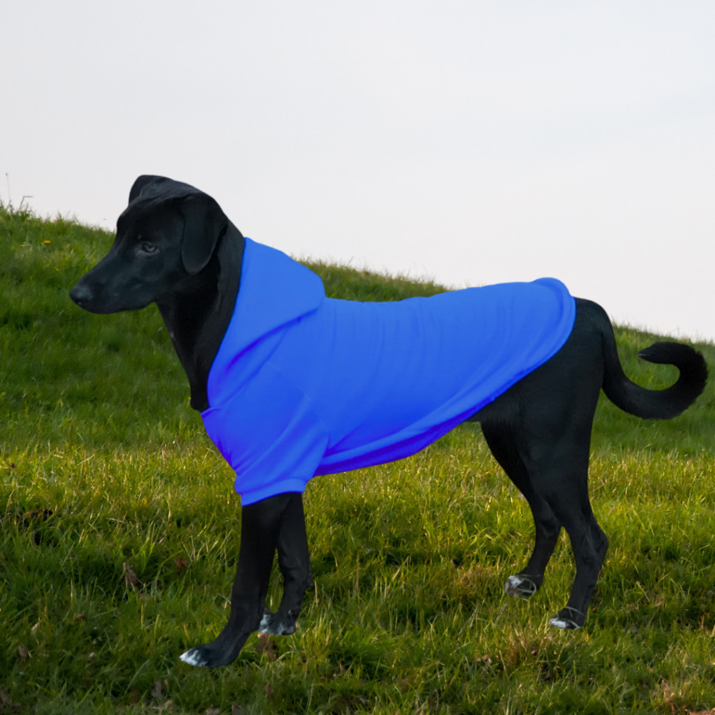 A pulóver takarja a kutya mellkasát, a két mellső lábat, és a has nagy részét.